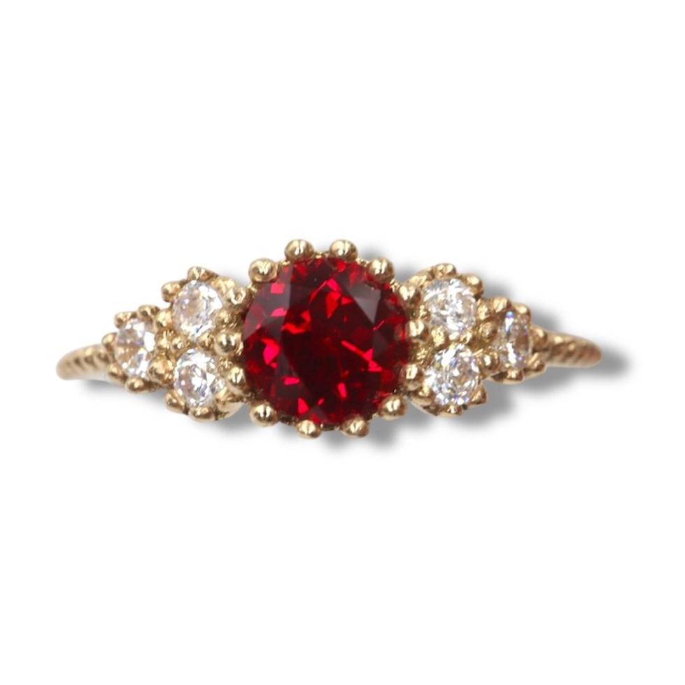 Celebra la pasión y el lujo con este exquisito anillo, una joya que evoca la opulencia de la realeza. Elaborado con la calidez atemporal del oro amarillo de 14K, el diseño se centra en un magnífico rubí de 5 mm, cuyo intenso color rojo profundo simboliza el amor y la vitalidad.