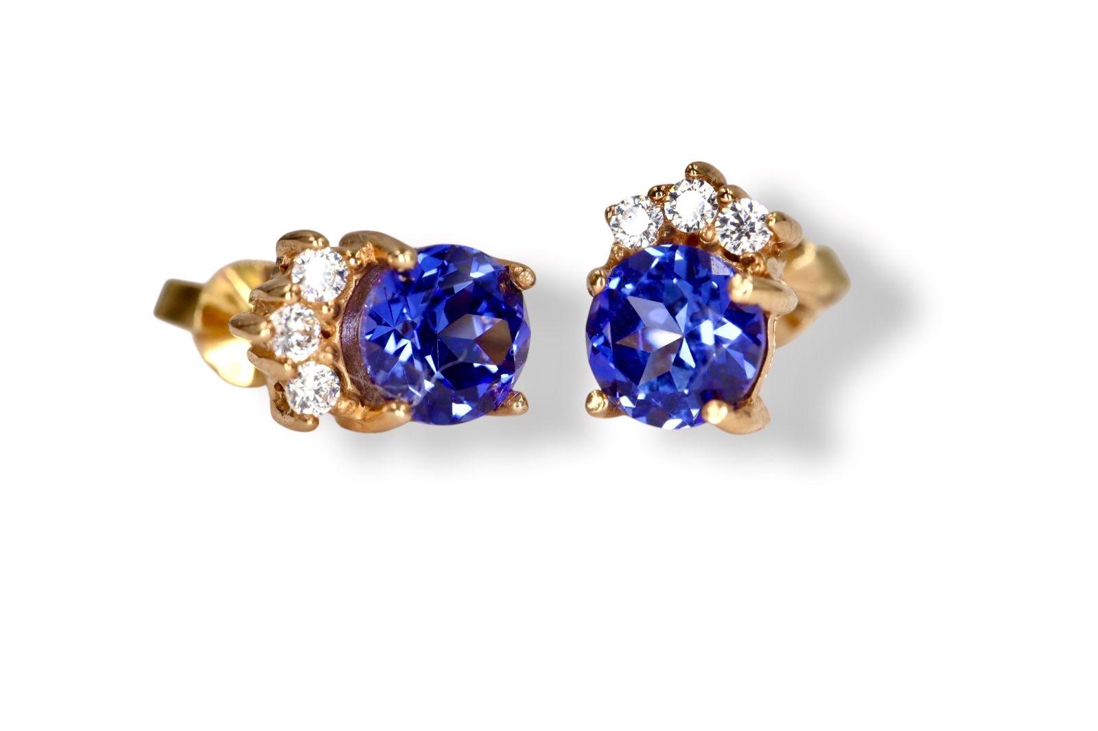 Aretes "Ojos del Cielo" en Oro Amarillo de 14K con Zafiros y Diamantes - 14K Oro Amarillo, 2 Zafiros 5mm, 6 Diamante 1mm