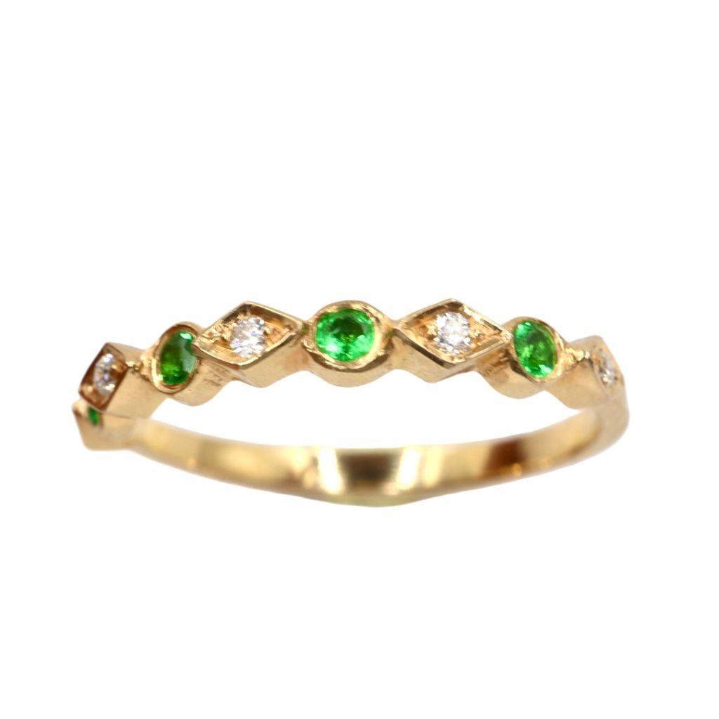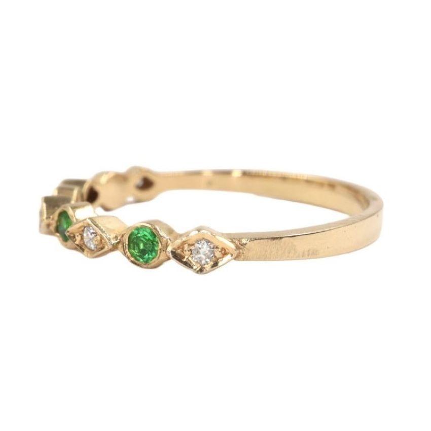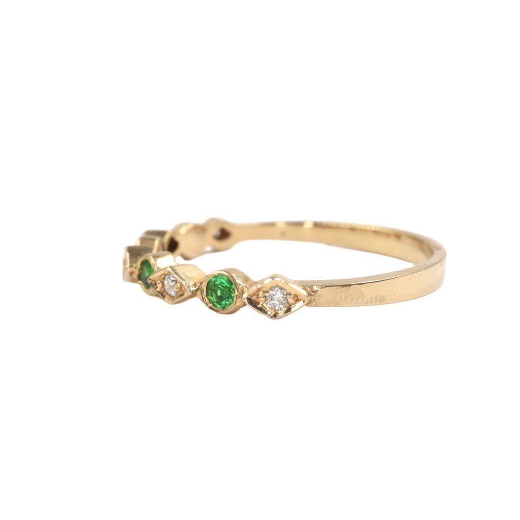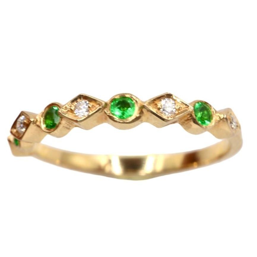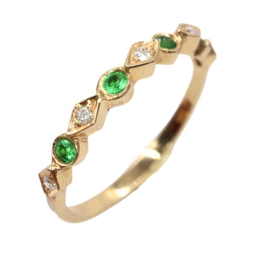 La banda est谩 exquisitamente adornada con una hilera de gemas que alternan en un patr贸n armonioso. Cuatro esmeraldas de 2 mm, con su profundo y vibrante color verde, evocan la frescura de la naturaleza y simbolizan el renacimiento. Estas gemas son acompa帽adas por cinco Diamantes de 1 mm, que aportan un brillo deslumbrante y crean un contraste perfecto de luz y color.