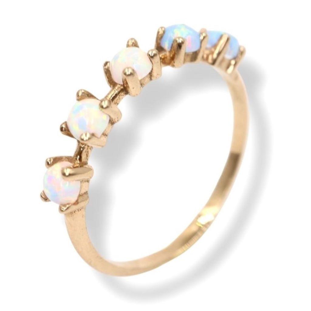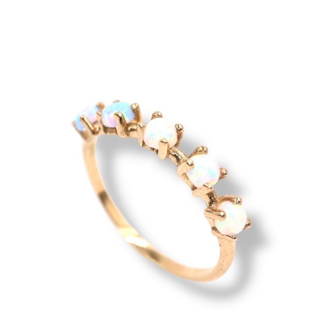 Este anillo es un portal a un mundo de ensueño, una joya que captura la iridiscencia mágica de la luna en una danza de color y luz. Elaborado en el cálido resplandor del oro amarillo de 14K, su diseño presenta una delicada hilera de cinco ópalos capuchón de 3 mm.