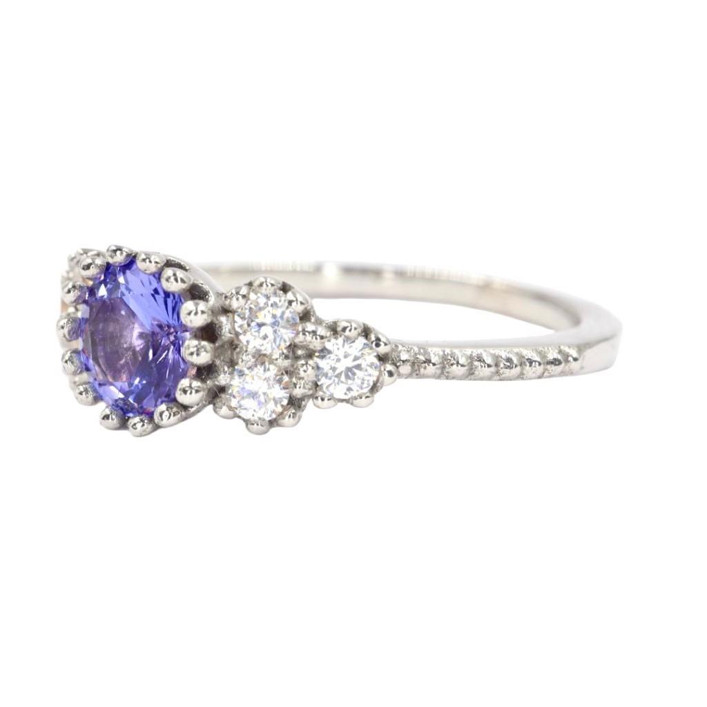 Anillo "Amanecer en el Kilimanjaro" en Oro Blanco de 14K con Tanzanita y Diamantes - 1 Tanzanita 5mm, 6 Diamantes 2mm, Oro Blanco 14K