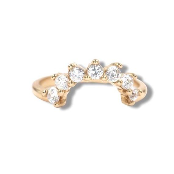En el centro de la pieza, un elegante medio cÃrculo de oro se convierte en el escenario perfecto para siete diamantes de 2 mm. Cada gema ha sido cuidadosamente seleccionada y engastada para formar un arco de luce, un camino resplandeciente que te recuerda los sueños que has construido y los que aún están por venir. Estos diamantes no solo brillan, sino que cuentan una historia de momentos preciados.