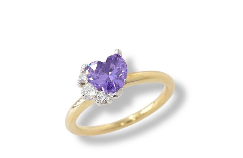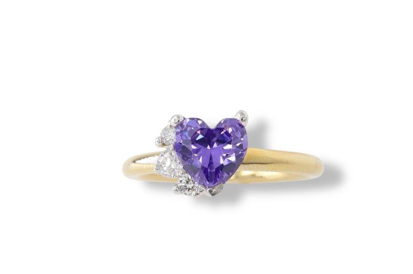Celebra el amor y la elegancia con este exquisito anillo, una joya que captura la esencia del romance eterno. En el centro de la pieza, una deslumbrante amatista de talla corazón (6x6 mm) irradia un profundo color púrpura, símbolo de la pasión y la devoción.