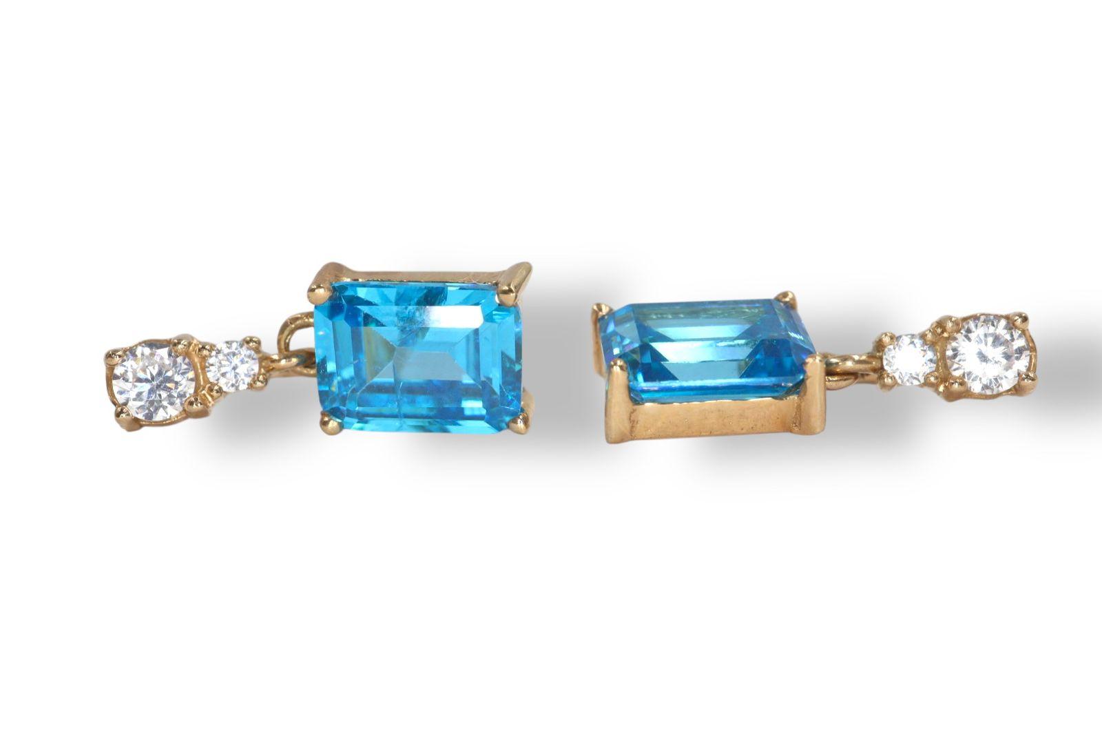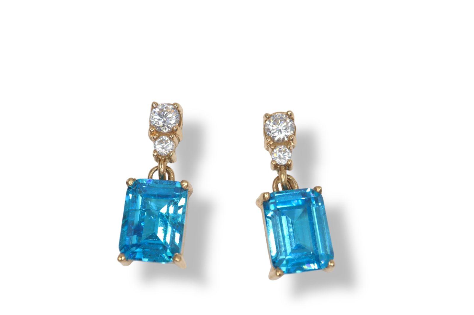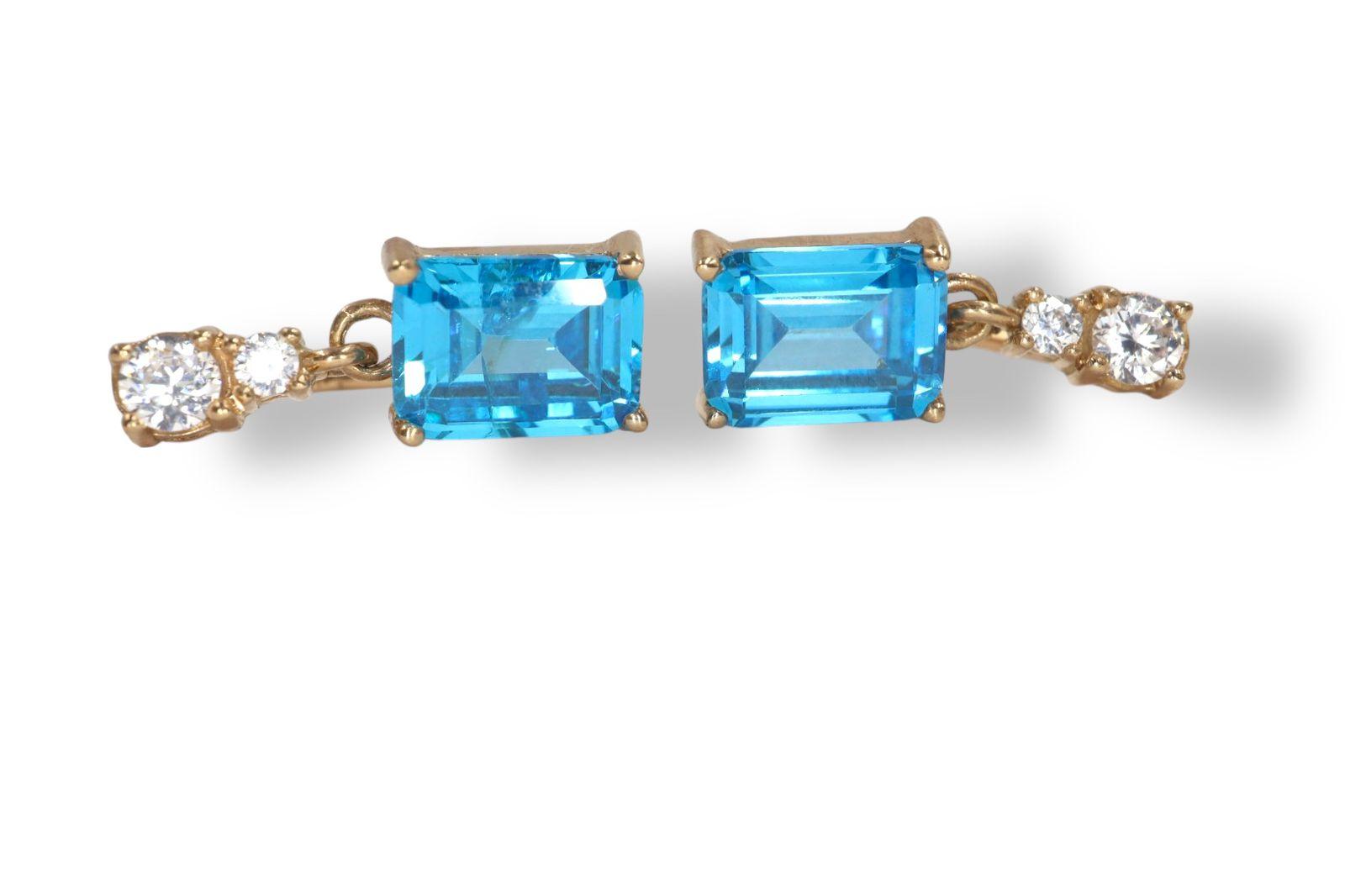 Aretes "Espejo del Cielo" en Oro Amarillo de 14K con Aguamarina y Diamantes - 14K Oro Amarillo, 2 Agua Marina Cuadradas 5X8mm, 2 diamantes 3mm, 2 diamantes 1 mm.
