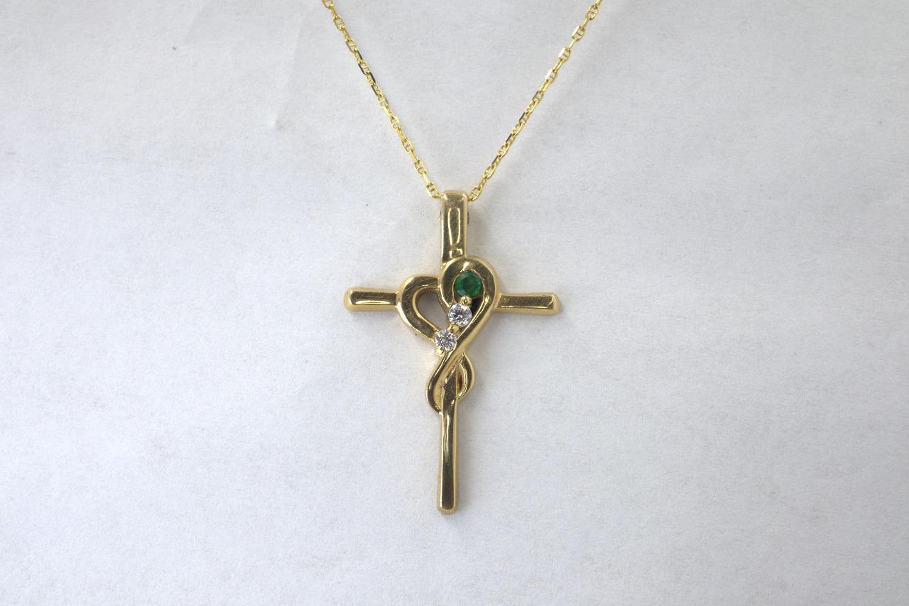 Dije de Cruz "Esperanza Eterna" en Oro Amarillo de 14K con Esmeralda y Diamantes - 14K Oro Amarillo, 1 Esmeralda de 3mm, 2 Diamantes de 2mm.