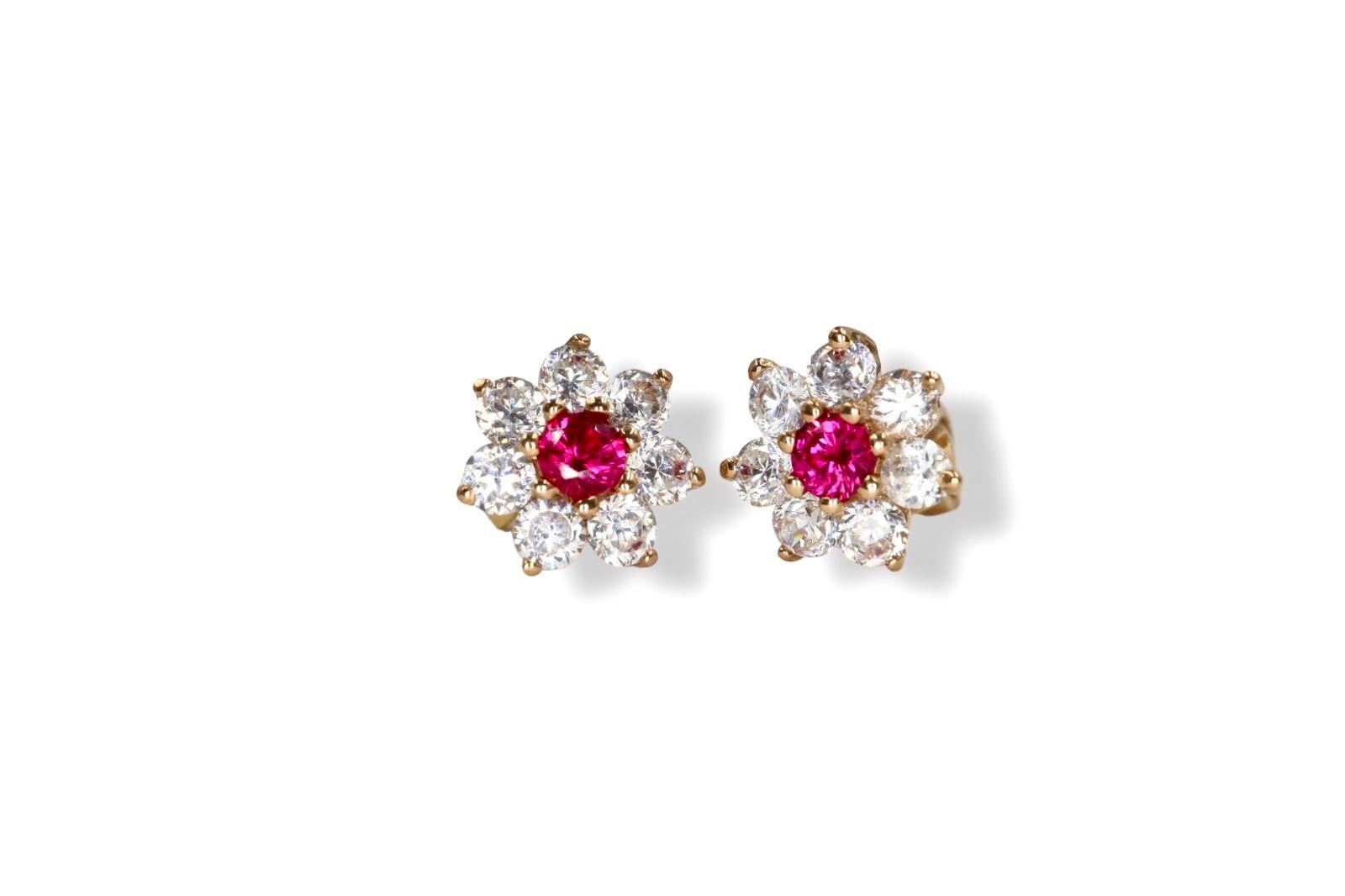 Aretes Broquel "Luz de la Promesa" en Oro Amarillo de 14K con Diamantes - 14K Oro Amarillo, 2 Rubí 3mm, 14 Diamantes 3mm