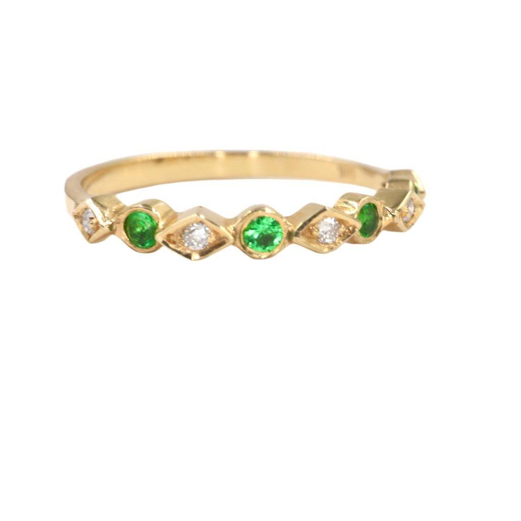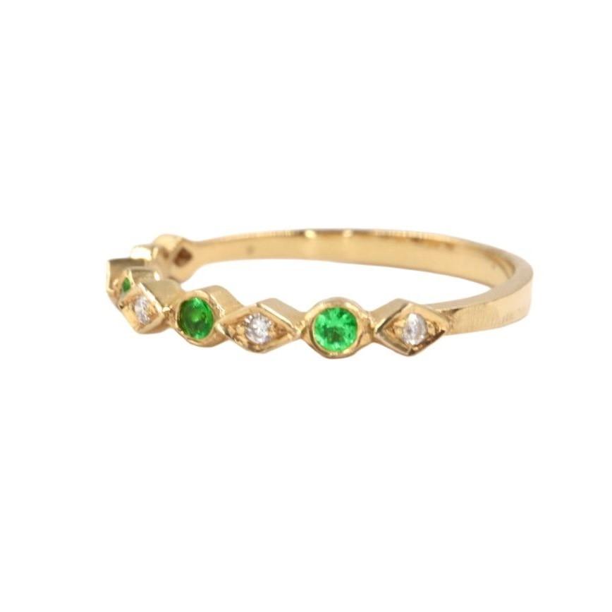 La banda est谩 exquisitamente adornada con una hilera de gemas que alternan en un patr贸n armonioso. Cuatro esmeraldas de 2 mm, con su profundo y vibrante color verde, evocan la frescura de la naturaleza y simbolizan el renacimiento. Estas gemas son acompa帽adas por cinco Diamantes de 1 mm, que aportan un brillo deslumbrante y crean un contraste perfecto de luz y color.