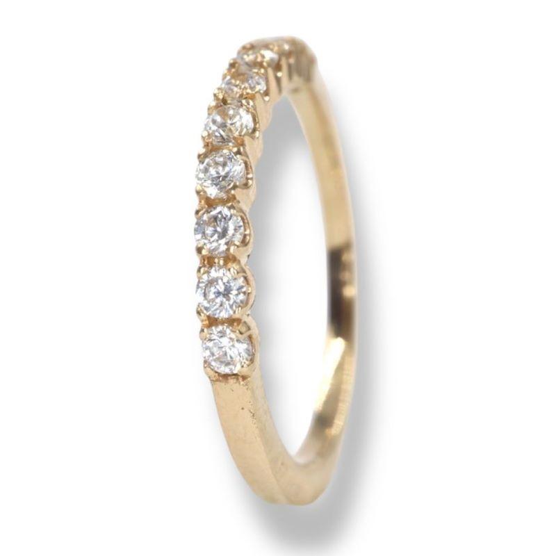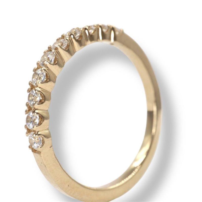 A lo largo de la banda, diez brillantes de 2 mm han sido cuidadosamente engastados, formando un río de luz pura y diamantes continuos. Cada gema es un reflejo de un hito, una risa shared o una promesa susurrada, creando una constelación de recuerdos que adorna la mano. La belleza del oro amarillo complementa perfectamente el resplandor de los diamantes, creando una armonía visual que es a la vez clásica y llena de vida.